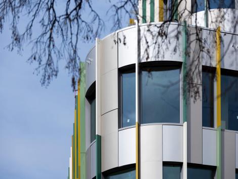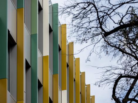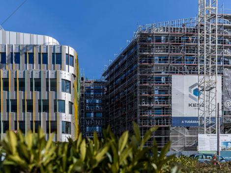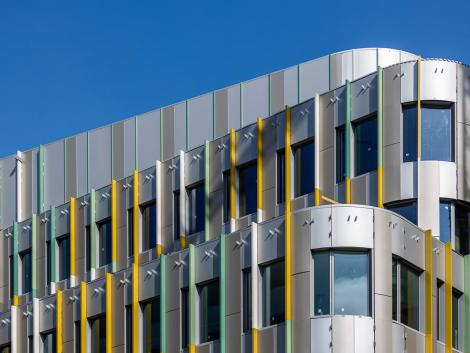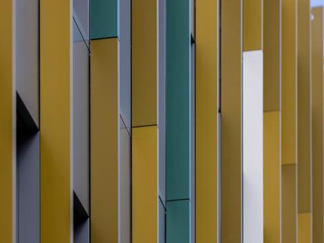 A kivitelezés során 4 300 m2 tálcásított, akasztott és 2 100 m2 sík kompozit homlokzati panelt szereltünk fel és közel 6 000 folyóméter színes homlokzati lizénát munkáltunk meg.