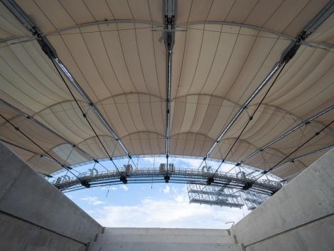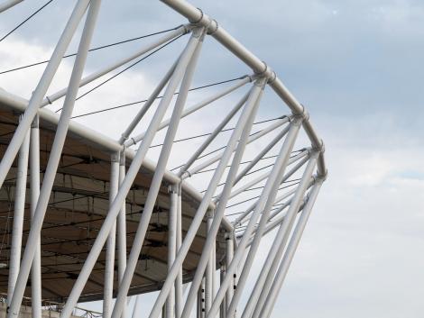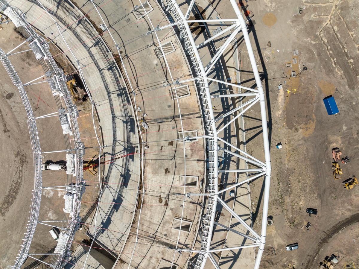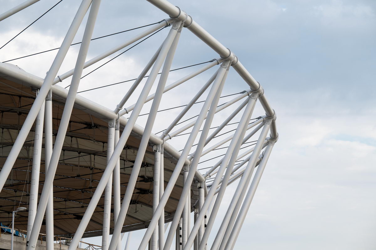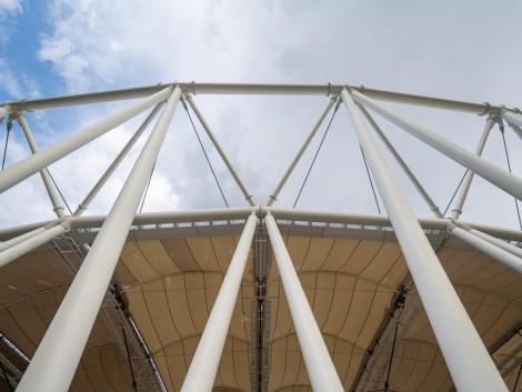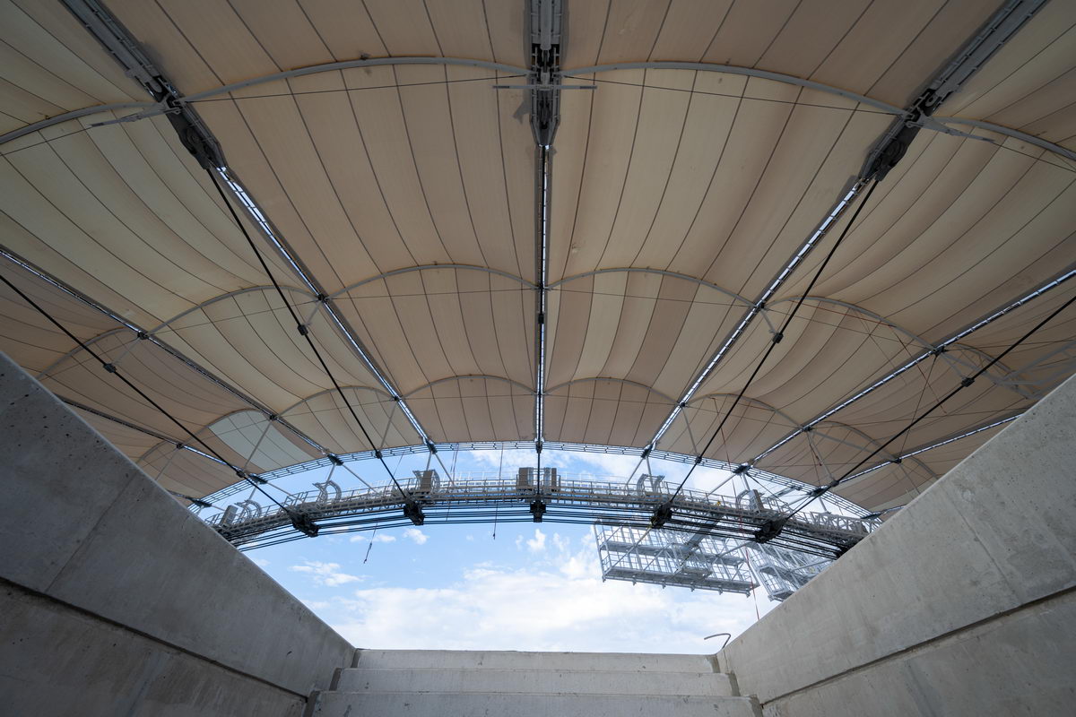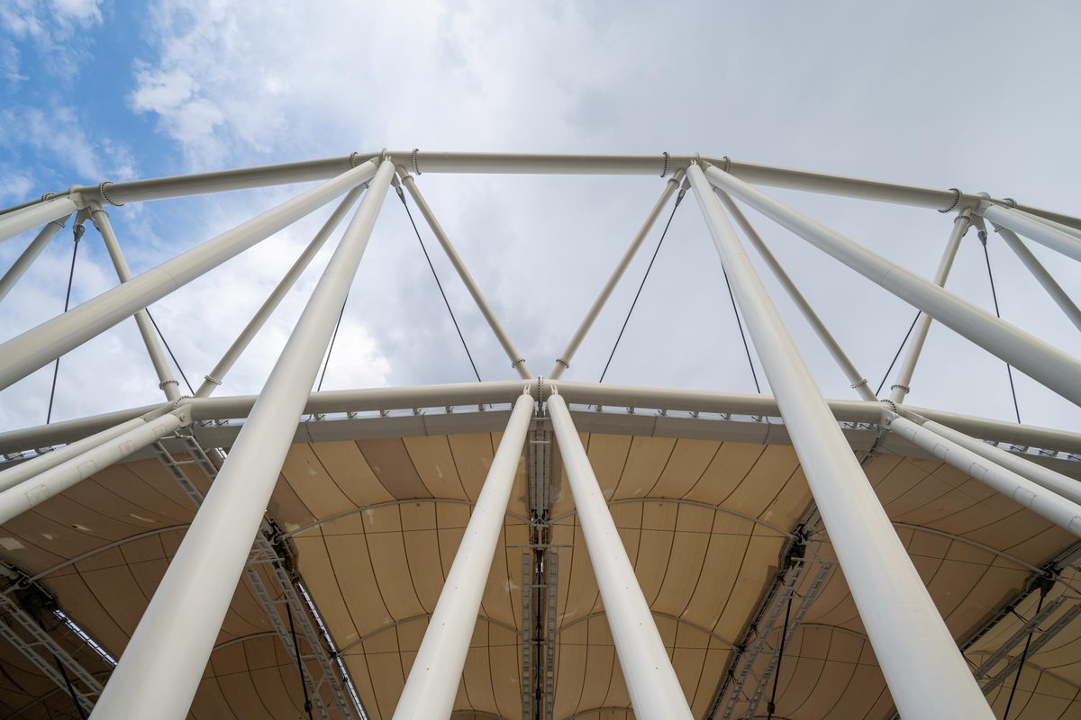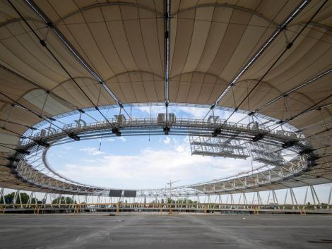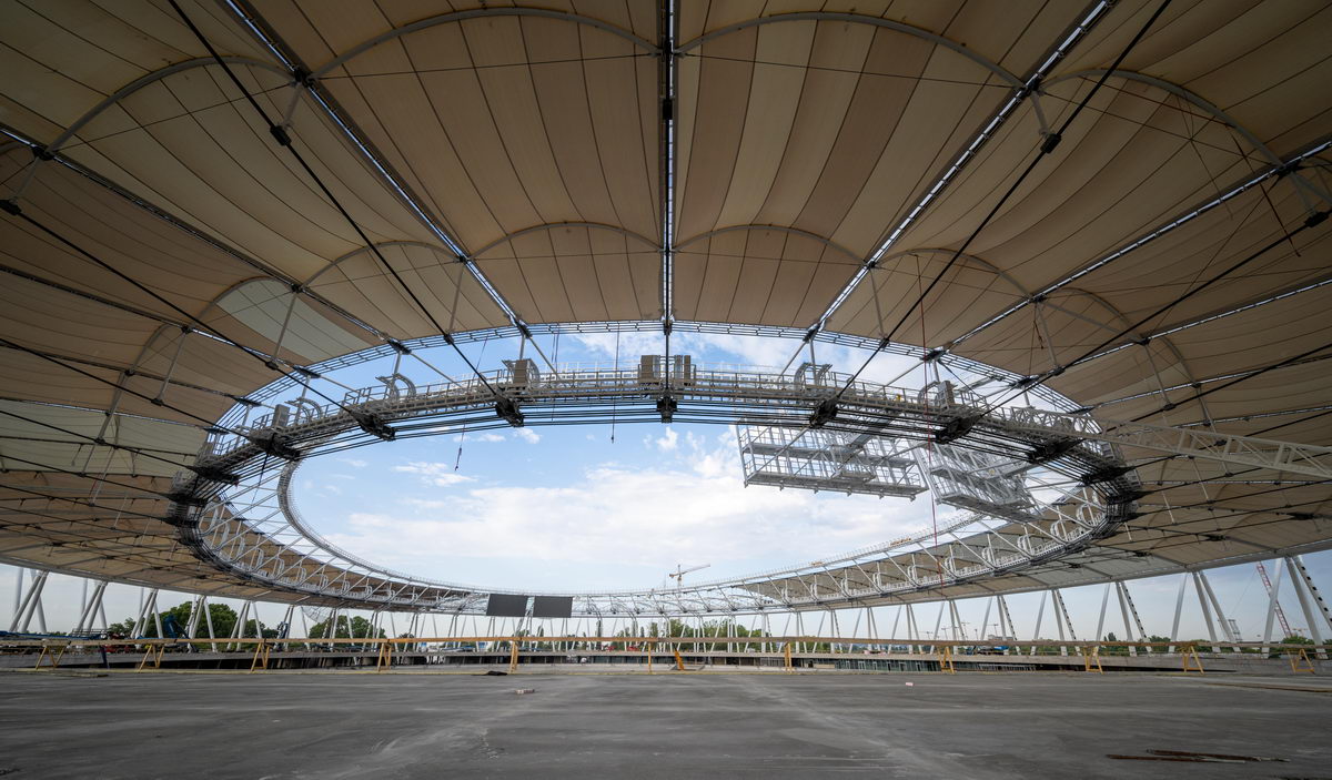 A 840 méter kerületű acélszerkezetet 48 darab egységből szereltük össze, ami összesen 384 darab szerkezeti elem precíziós gyártását igényelte. Erre a szerkezetre került legyártásra és felszerelésre 268 darab különböző átmérőjű és különböző hosszúságú kábel. A kivitelezési munkákat követően mind a merevacél szerkezet, mind a kábeltető a tervezett alakra állt be pár milliméteres eltéréssel. Ez az érték egy ekkora épület tervezése esetén egyedülálló teljesítmény.